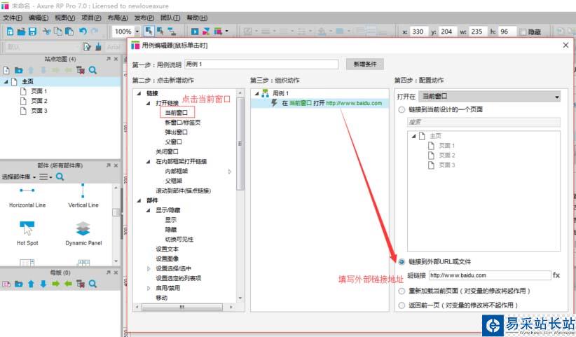 5、彈出用例編輯器,在用例編輯器中可以設定鼠標點擊時,觸發什么樣的效果,這里我們選擇在當前窗口打開一個地址鏈接。如圖所示