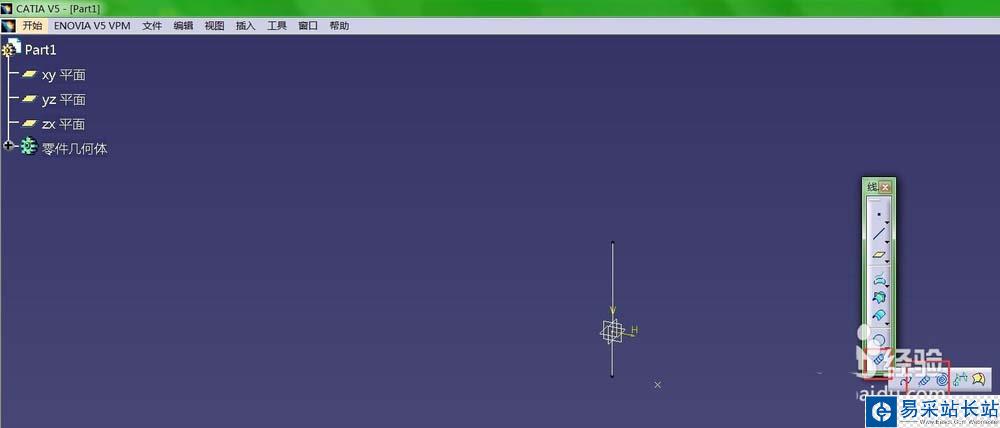 5、單擊“退出工作臺”按鈕,退出草圖編輯器,此時零件設計主界面如圖所示,可以看到創建的直線和點。
