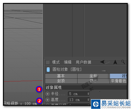 3、把圓柱挪到目標位置。然后,我們再設置下圓柱的大小;在“半徑”這里設置為5;在“高度”這里設置為13。