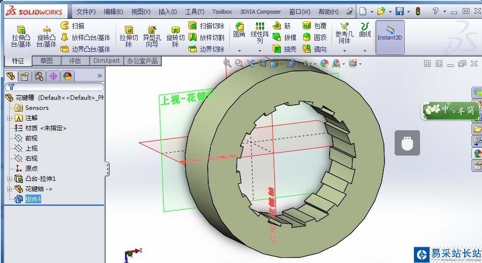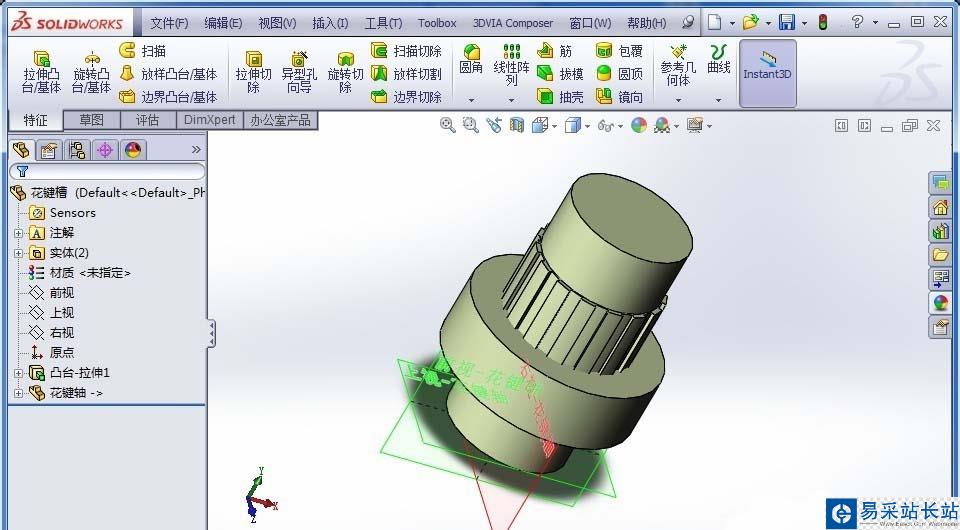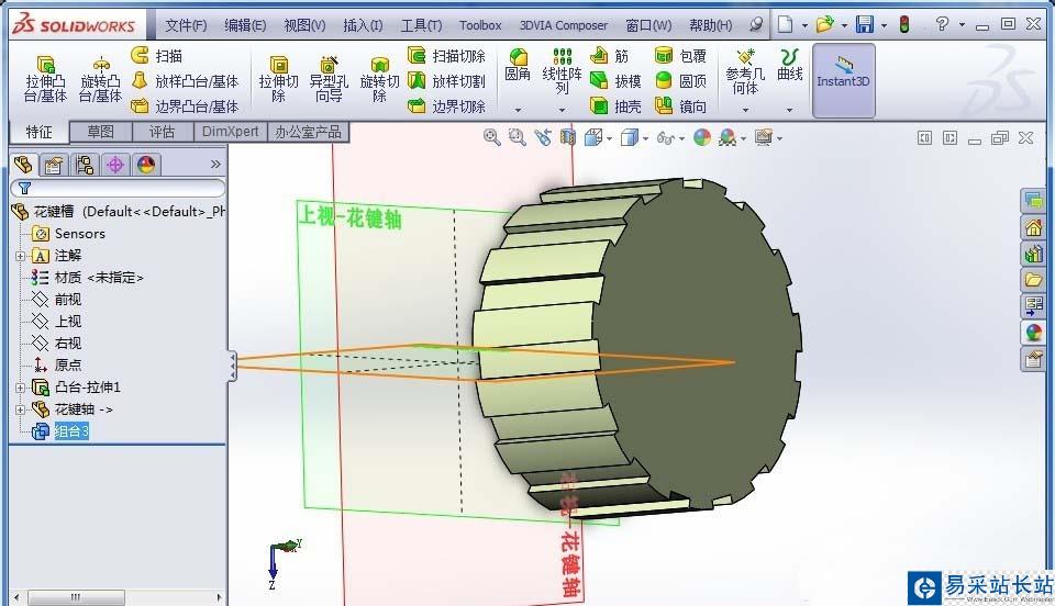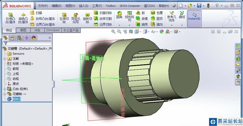 4、這里我們要借助花鍵軸來做出鍵槽,在組合選項中點選“刪減”,即將兩個零件重合的部分去除。將“主要實體”選擇為花鍵槽圓柱,將“要組合的實體”選擇為花鍵軸,這樣在執(zhí)行組合后就將保留圓柱上除公共部分外的材料,這里的效果就是在圓柱中做出了花鍵槽,如下圖所示: