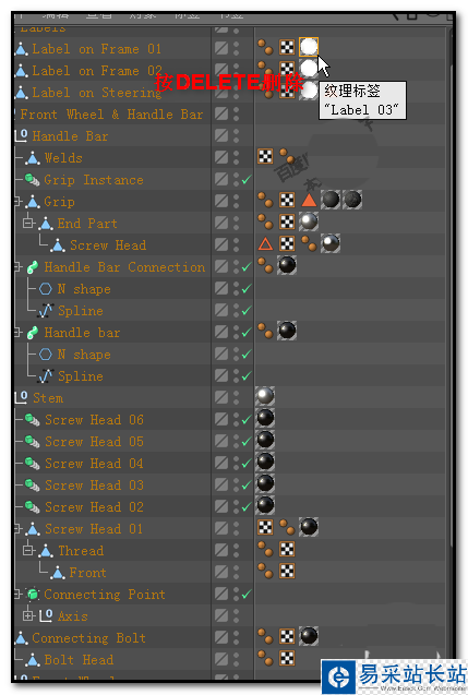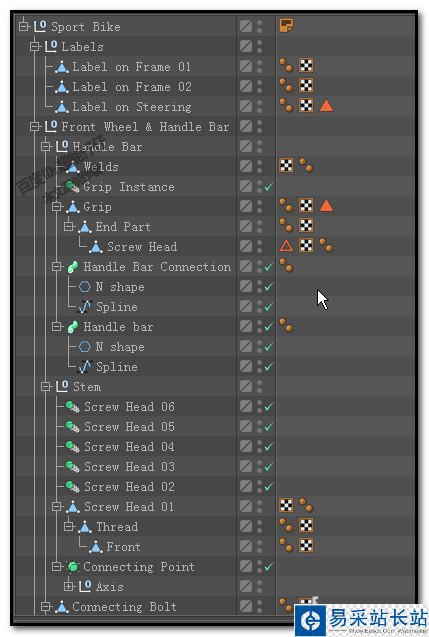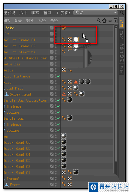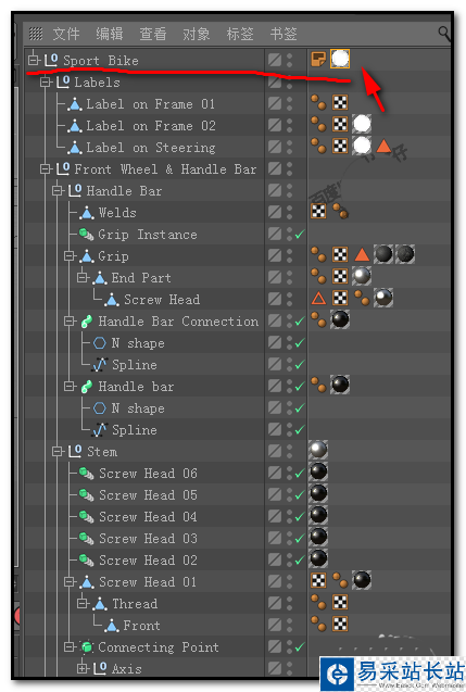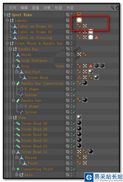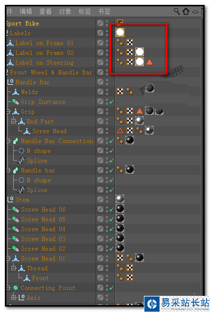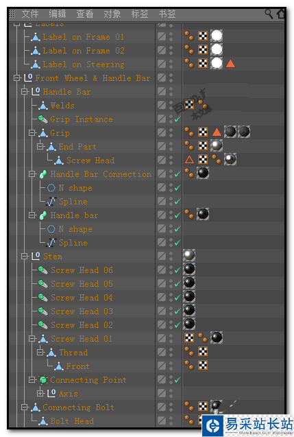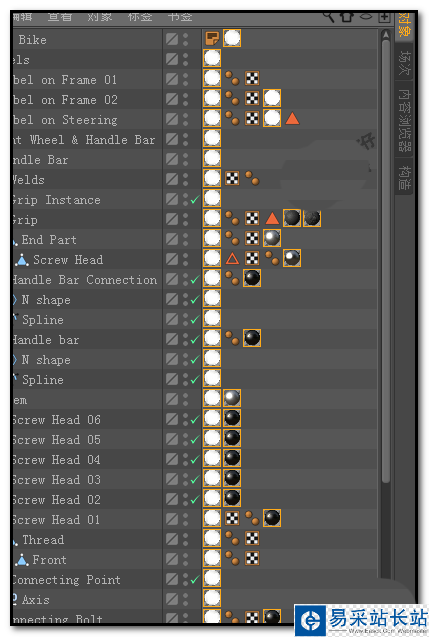 1、如下圖中所示,這是從C4D預置中調出來的一個自行車模型的對象面板;這里使用著大量的紋理標簽,假設,我們現在要把這所有的紋理標簽給刪除掉。