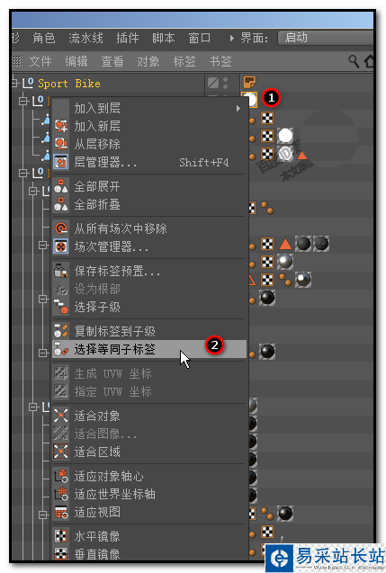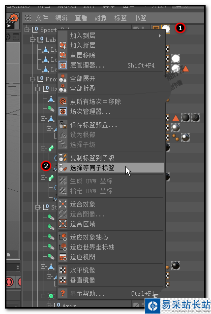 6、然后,鼠標右擊該標簽,,彈出菜單中點:選擇等同子標簽(本步驟第一張圖所示);這時,我們可以看到整個對象面板中的所有紋理標簽都給選中了(第二張圖)。