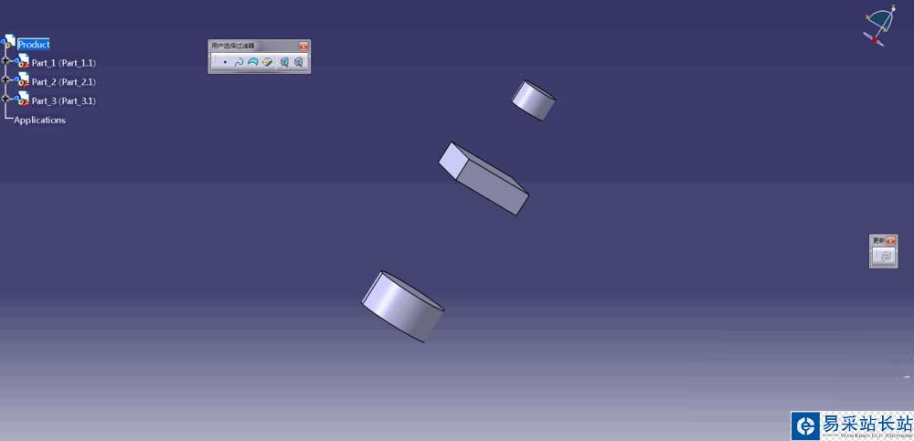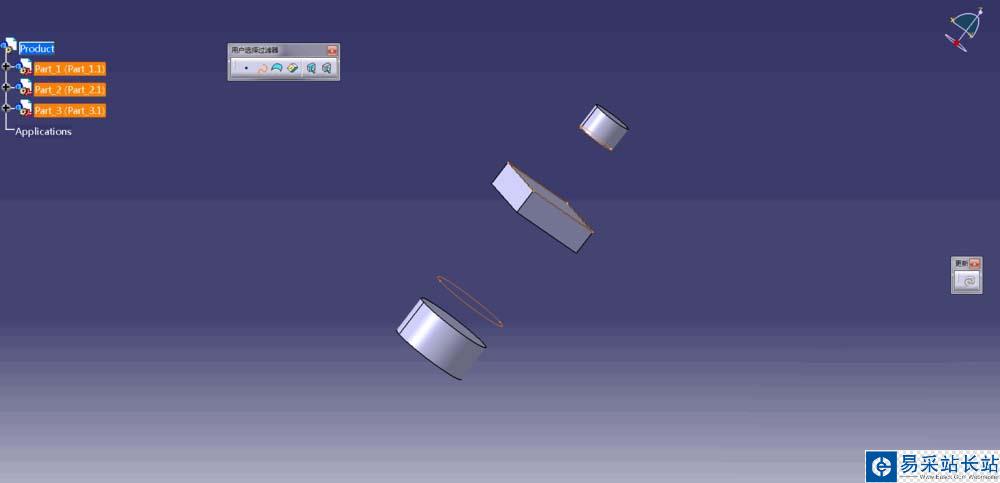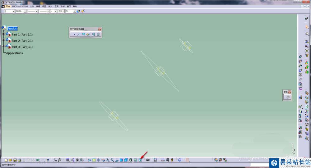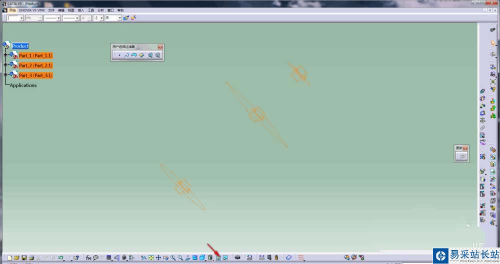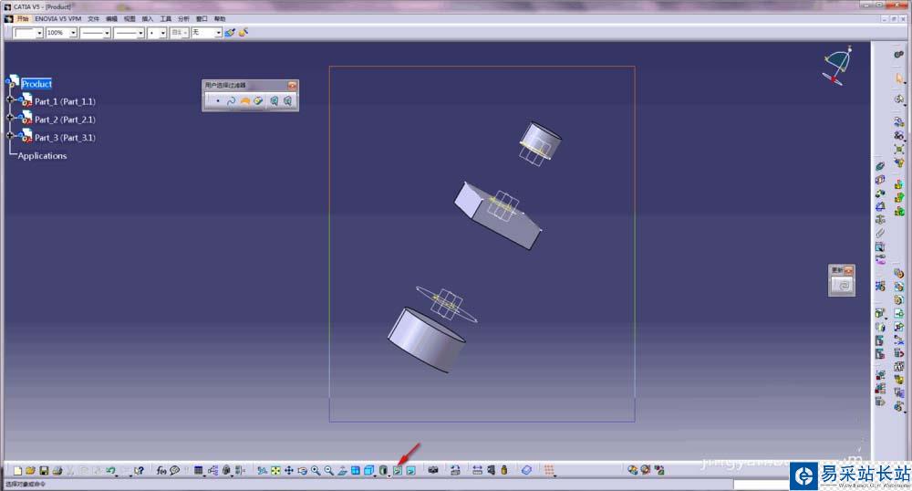 1、首先我們打開任意一個CATIA裝配體模型,可以看到模型中共有三個零件,他們的基準面以及草圖都顯示在三維界面中,在建模完成以后,這些元素已經沒有需要被隱藏起來;