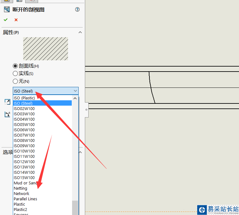 8、之后就可以在上面的框里下拉出很多剖面線的形狀,找到合適的換上去即可。