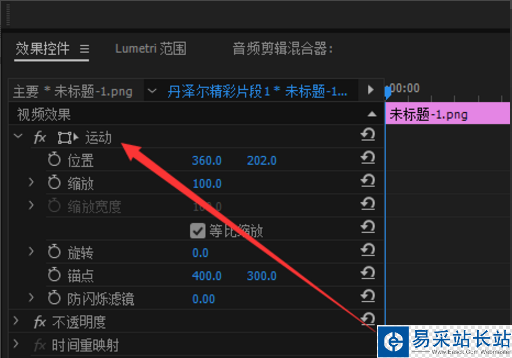 6、然后選擇上方這個效果,接著彈出一個更詳細的屬性框,我們在這里找到運動,就在第一個,點擊一下。