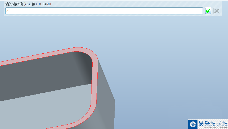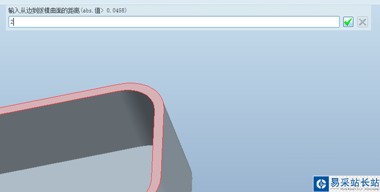 5、根據(jù)系統(tǒng)提示輸入邊到拔摸曲面的距離,即“唇”的寬度,操作過程如下圖所示。
