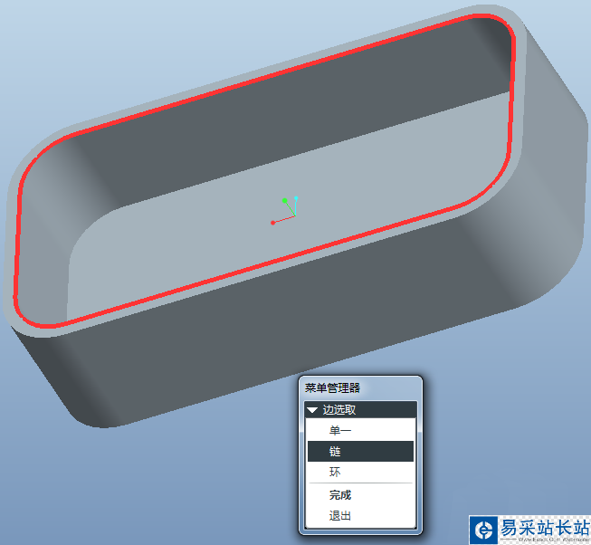 3、系統(tǒng)會(huì)打開唇的菜單管理器,“邊選取”項(xiàng)選擇“鏈”,根據(jù)提示選取開口端面的內(nèi)邊,選好后,點(diǎn)擊完成退出“邊選取”。