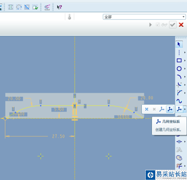 4、在環形折彎屬性窗口,勾選 “實體幾何”,點擊“輪廓截面”按鈕后面的“定義”,選取一個端面進行繪制截面形狀,截面形狀必須是開放的,且必須添加一個幾何坐標系,其定義及草繪過程如下圖所示。