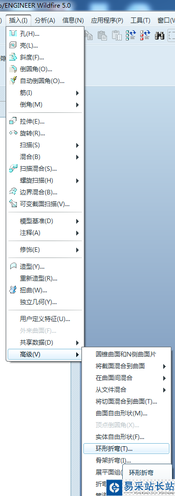 3、依次點擊菜單欄的插入-高級-環形折彎,進入環形折彎的操作界面,過程如下圖所示。