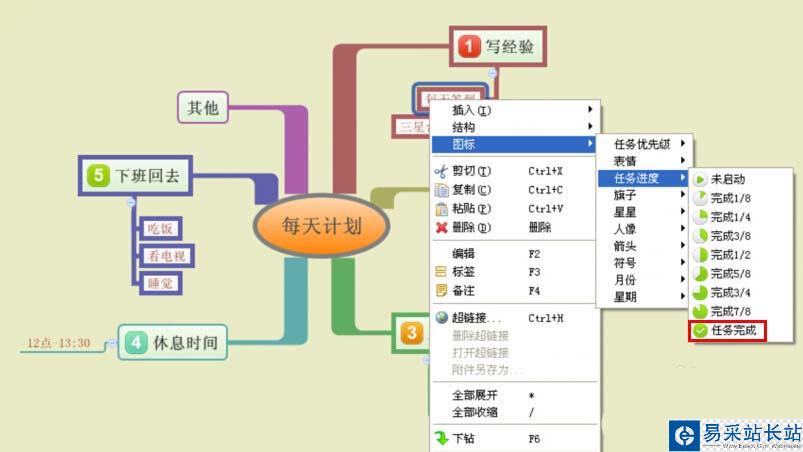 6、還可以對每天計劃子主題的下一級子主題中的每天具體的工作進行任務進度的標記,點擊鼠標右鍵,在圖標下選擇任務進度,然后按完成情況程度進行標記。(如下圖)