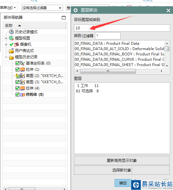 5、在第一欄指定層的數字;(UG中共有1-256層,設計師可以自由選擇圖層)