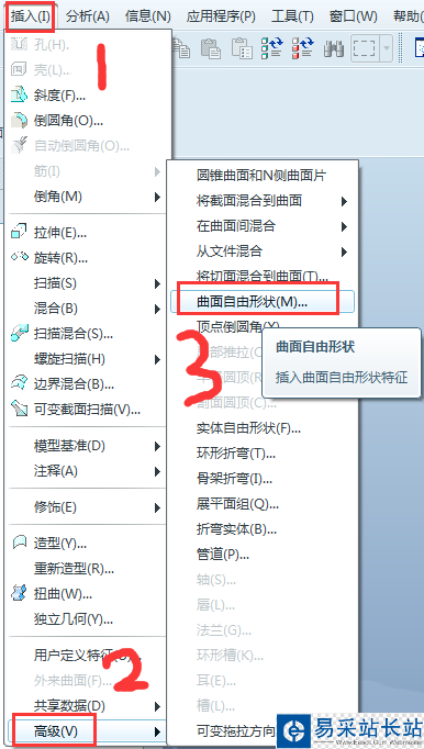 2、依次點擊“插入”-“高級”-“曲面自由形狀”。