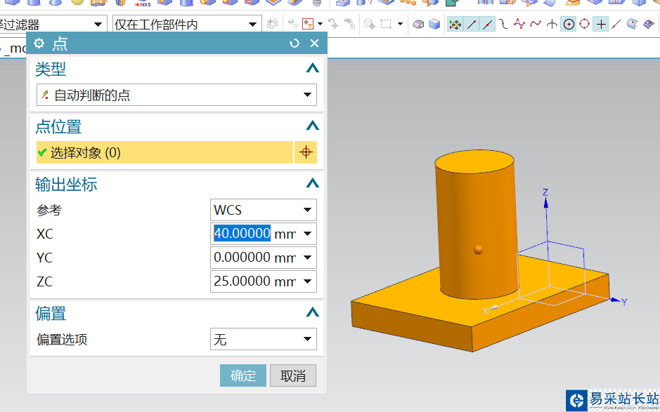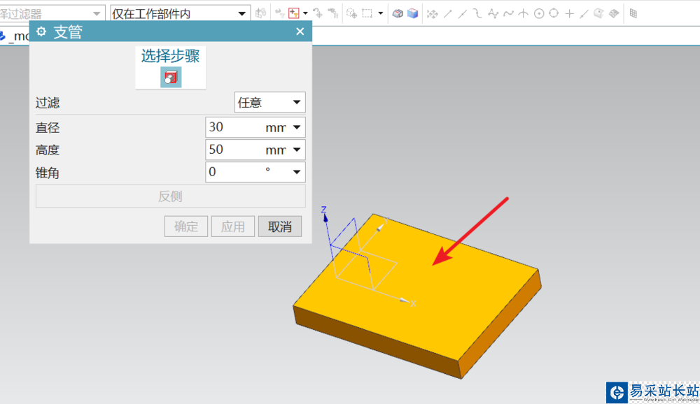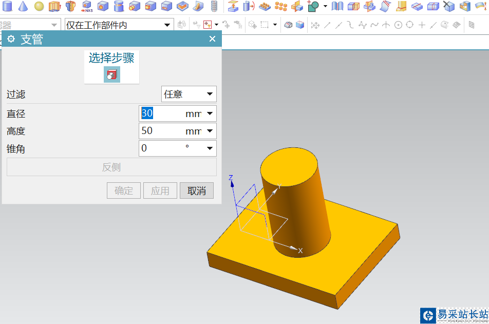 2、在立方體的上面添加凸臺,直徑30高度為50;定位于立方體的中心位置。