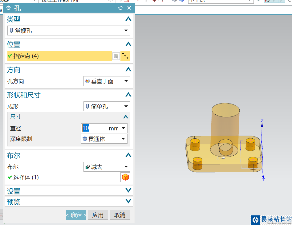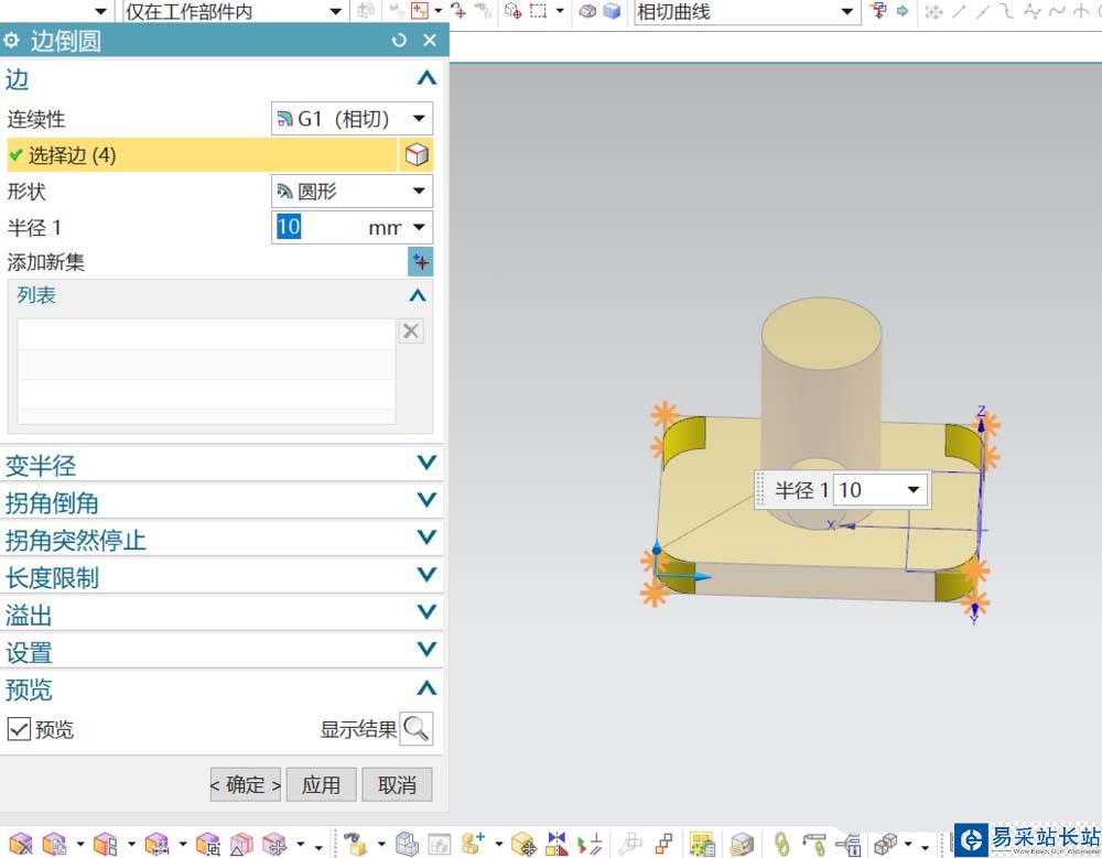 4、對立方體四角進行倒圓角半徑為10,以圓角的中心為定位點,開直徑為10的四個孔。