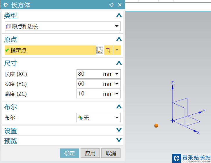 1、在建模模式下,創(chuàng)建立方體長寬高分別為:80、60、10;定位時將60寬分中定在坐標軸上,如圖所示。讓立方體寬的兩端點對稱于坐標原點。