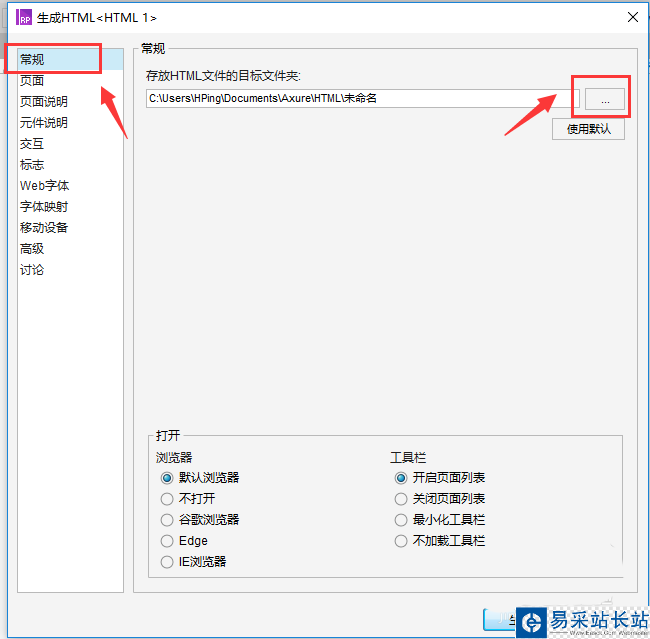 6、選中【常規】-->點擊路徑后面的【...】按鈕,修改【存放HTML文件的目標文件夾】--> 【生成】。