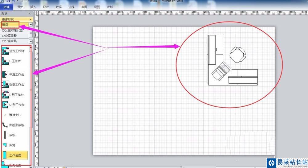 3、從隔間中選擇需要的工作臺布局,然后拖動至繪圖區(qū)域。