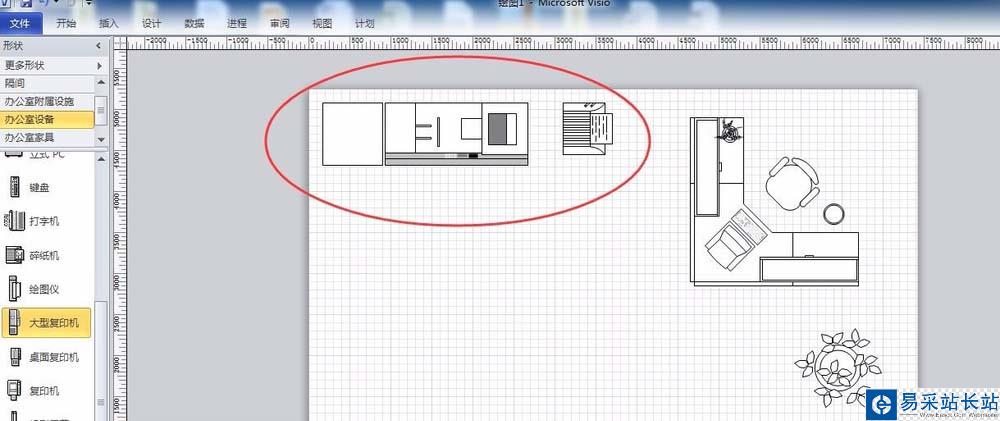 5、接下來根據(jù)設(shè)計(jì)需要添加電腦、打印機(jī)等辦公設(shè)備。