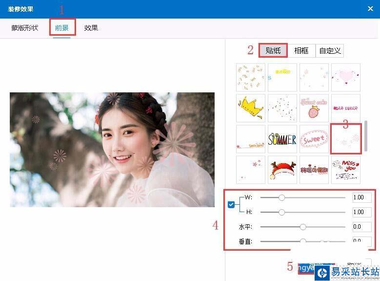 “前景”->“貼紙”->選擇一種貼紙->調(diào)整貼紙的寬高、水平垂直效果->“確定”