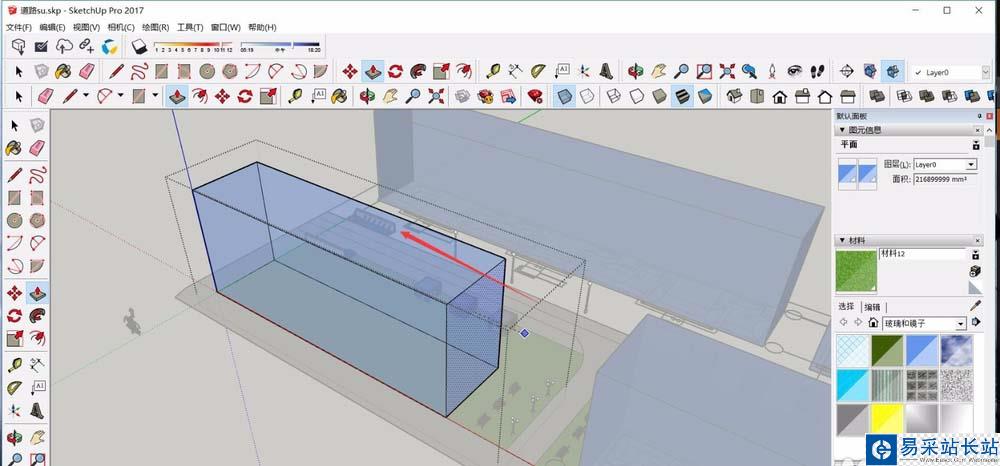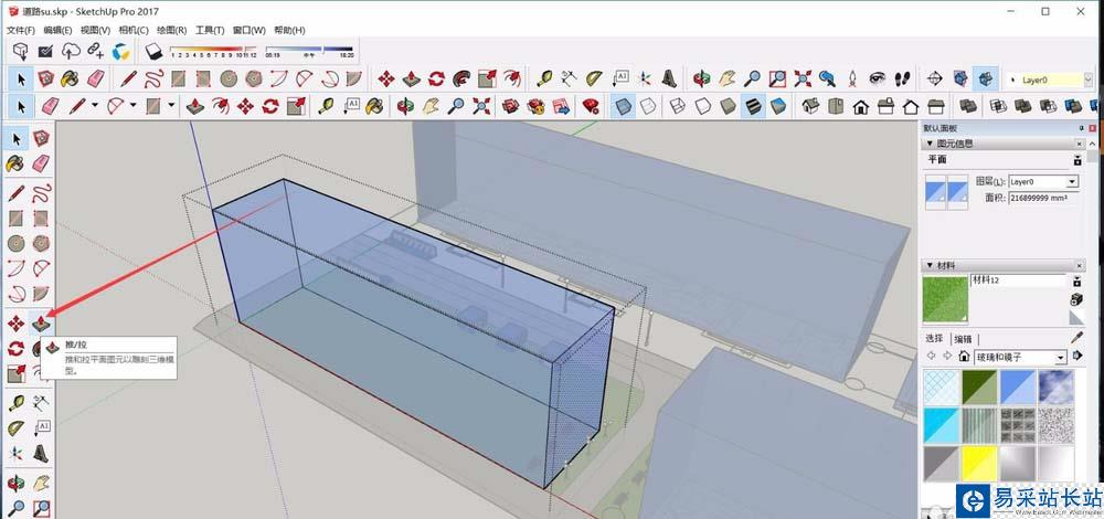 4、此時我們可以選中圖塊的某個單位,在Sketchup左側(cè)工具欄中點擊拖/拉工具,即可選中某一個面進行拖拽。