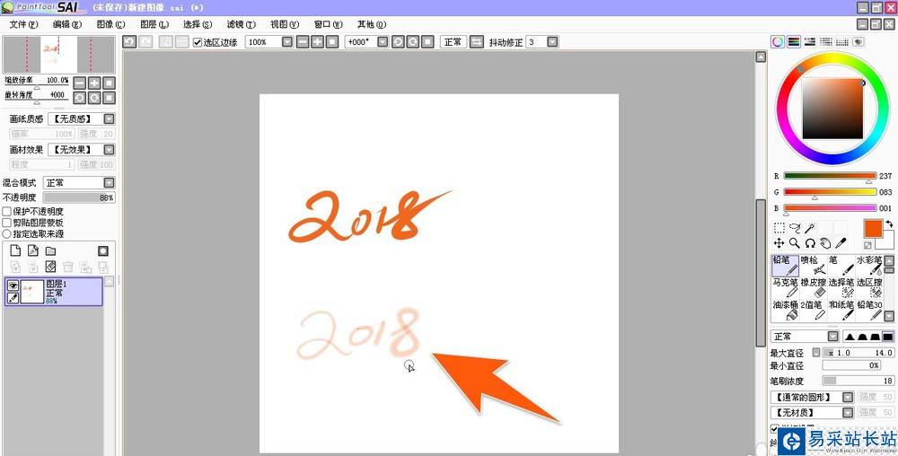 6、另外,如果用的是不彩畫筆,要調整畫圖時的圖像透明度,那么就可以通過拉動那個灰色條,增加水分量,也能實現圖像透明度調整后的效果。
