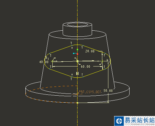 4、建立斜面上的繪圖基準平面,并在新建的基準平面上繪制二維圖形,以拉伸的方式生成實體