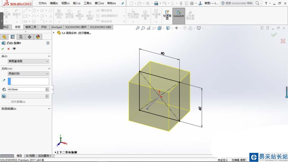 2、選定前視基準面,正視所選基準面,利用直線命令進行繪草圖,并設定相關尺寸。采用拉伸凸臺特征命令,點擊確定。