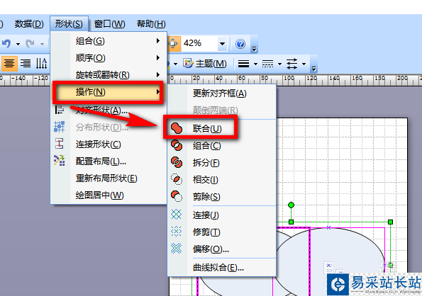 5、點擊形狀后會出現一個下拉列表,在列表中選擇【操作】選項,然后在操作的列表中選擇【聯合】選項。