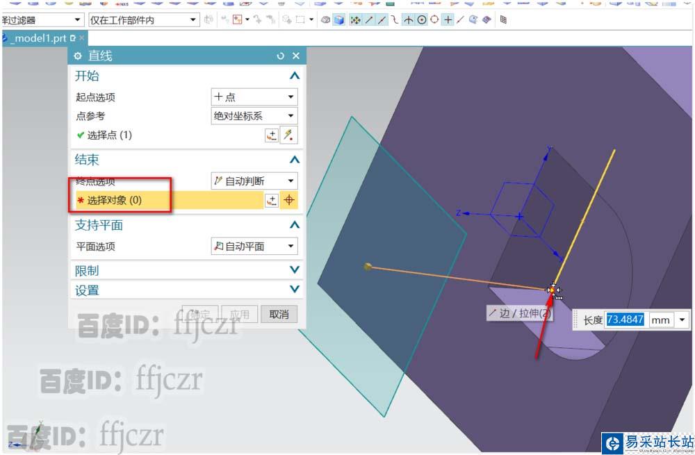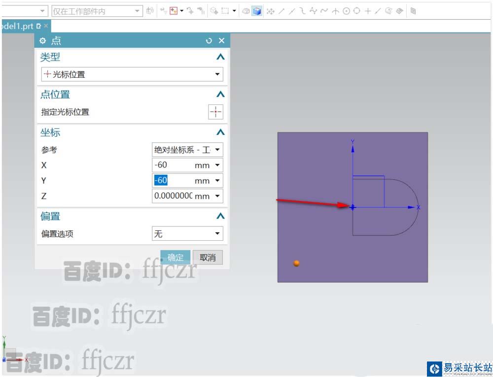 6、使用建模中的曲線來構線一定要有明確的坐標數值及相應參照點。在這里因為剛創建主體時主體的中心處于坐標原點,通過圖紙所給數據就可以確定直線的兩端點了。第一條直線的端點,坐標(-60,-60);另一端點為凹槽下的頂角點,直接用捕捉就可以得到。