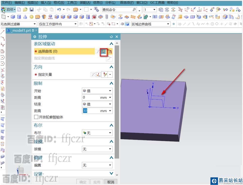 4、完成草圖,選擇向下拉伸30,并與主體進行布爾求差。得到模型凹槽直身結構。