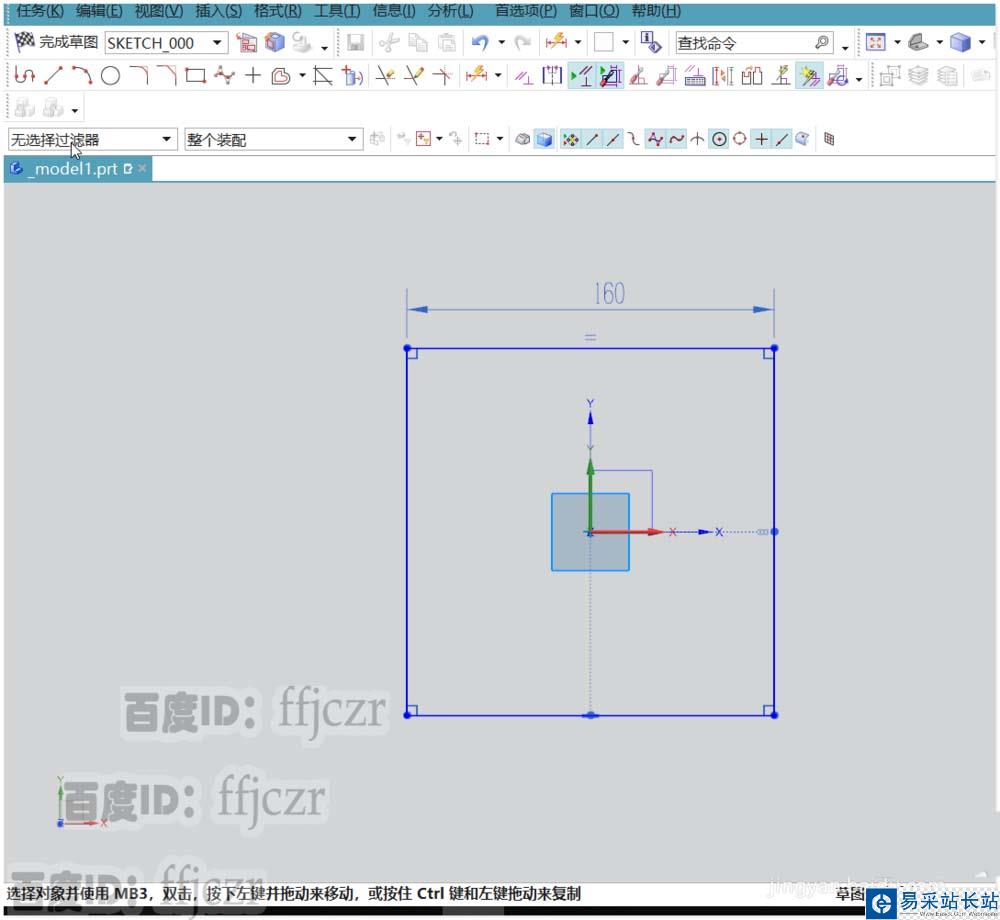 1、首先,創建出模型的主體。其主體為一正方形板,直接選用拉伸命令,在XY面上繪出一個中心位于坐標原點的正方形,長度為160。這個中心處于原點這一點十分重要。