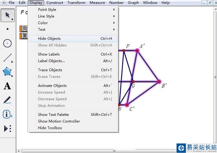6、選中△A’B’C’和線段AA’、BB’、CC’,執行“顯示”——“隱藏對象”命令,將不需要的對象進行隱藏。