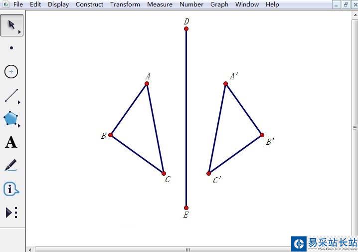 2、選中線段DE,執行“變換”——“標記鏡面”命令;然后選中△ABC,執行“變換”——“反射”命令就得到了△A’B’C’。