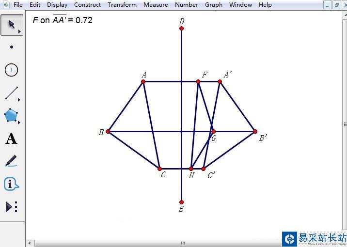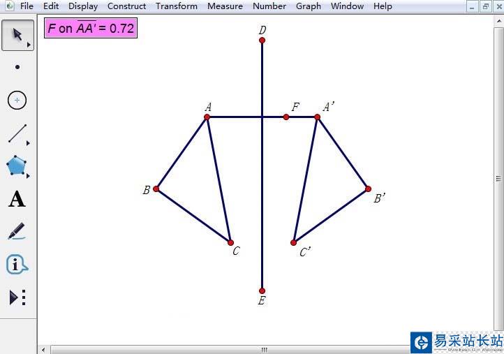3、使用線段工具連接線段AA’,在線段AA’上任取一點F,選中點F,執行“度量”—“點的值”命令,得到點F在線段AA’上的值。
