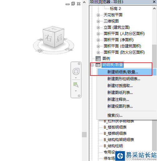 1、通過項目瀏覽器,下明細表/數量,右鍵新建明細表