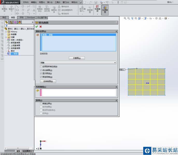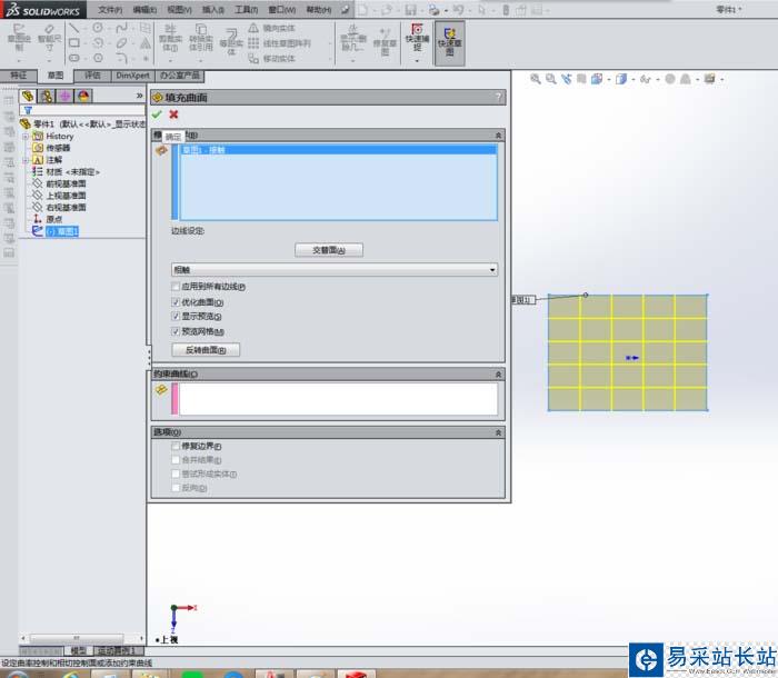 5、如下所示,進入“填充”對話框之后,就選擇矩形草圖,然后點擊左上角的√,完成曲面的填充,一個曲面就造好了。