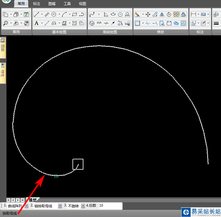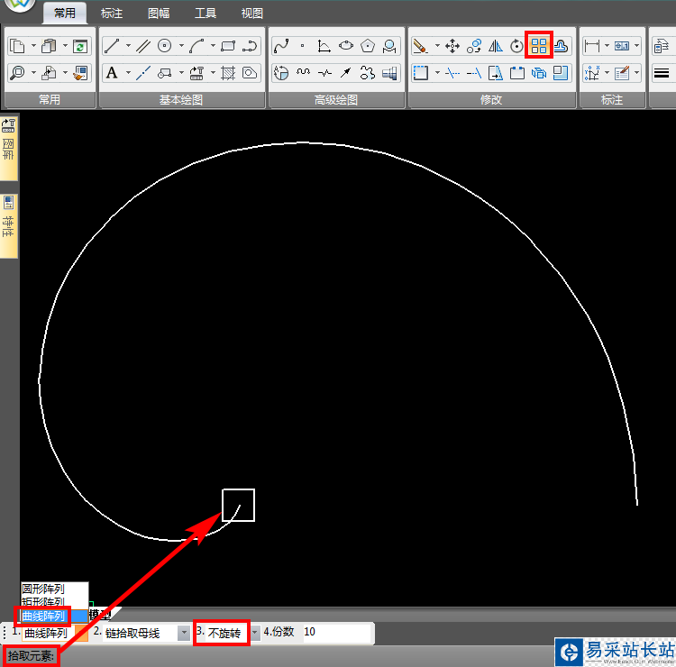3、點(diǎn)擊陣列命令,左下方第1個(gè)選項(xiàng)選擇“曲線陣列”,第3項(xiàng)選擇“不旋轉(zhuǎn)”,份數(shù)10份,該命令第1步拾取元素,即選擇要陣列的圖形,選擇結(jié)束,右鍵確認(rèn);
