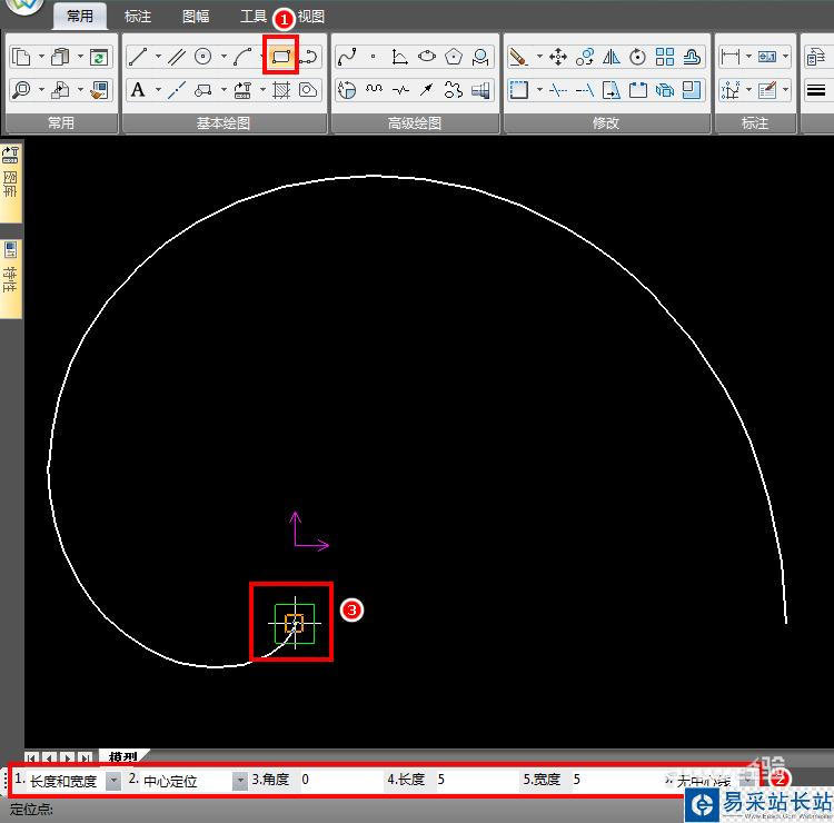 2、接著繪制要陣列的圖集,這里使用矩形命令繪制一個(gè)小的正方形作為演示,以曲線端點(diǎn)為中心繪制正方形;