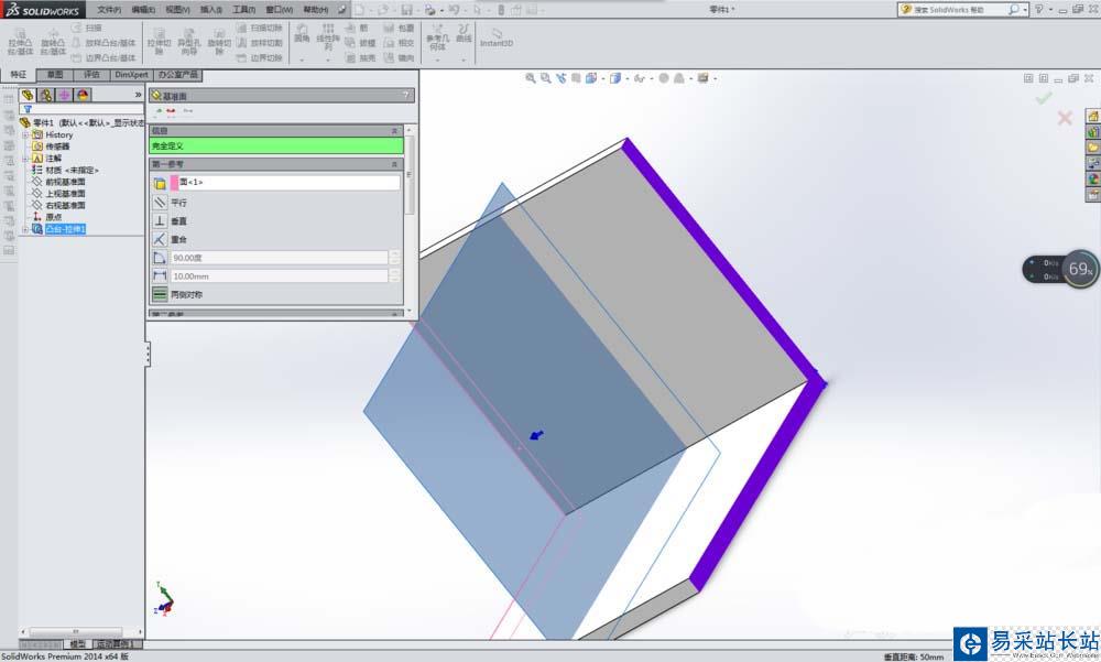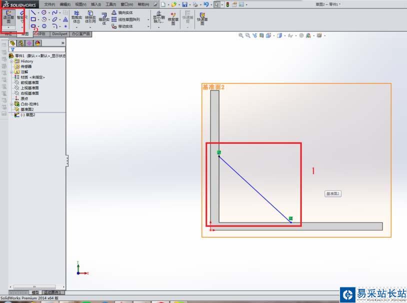 5、點√,一個新的基準面就創建完畢了。如下圖所示。解釋一下,下圖中的是基準面2,那是因為筆者操作太快,創建基準面1的時候忘了截圖,所以重新來過一遍,就成了基準面2了。