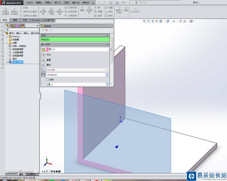 1、打開SolidWorks軟件,新建一個零件文件,并用“拉伸凸臺/基體”命令造一個90°的實體,作為演示所用,實體形狀如下第二幅圖所示。