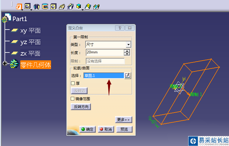 5、點擊輪廓曲線下方的選擇對話框后選擇我們繪制好的草圖,呈現出凸臺的預覽狀態,點擊確定,長方形凸臺繪制完成