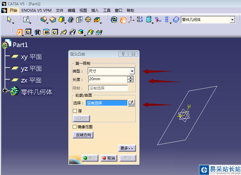 4、點擊凸臺命令,彈出定義凸臺對話框。類型下拉菜單里面常用到尺寸、直到下一個,長度即凸臺的厚度,輪廓曲線即我們剛完成的草圖