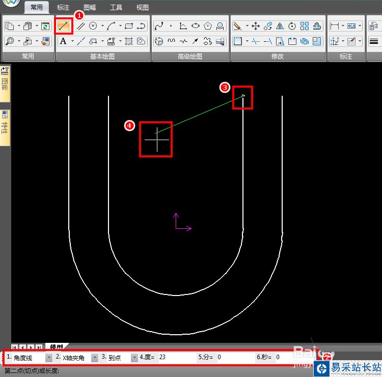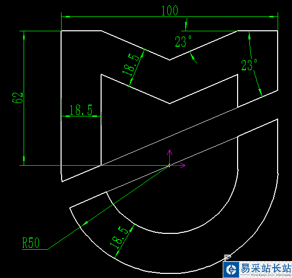 6、以等距后圖形的右上角為起點(diǎn)繪制與X軸夾角23°的直線;