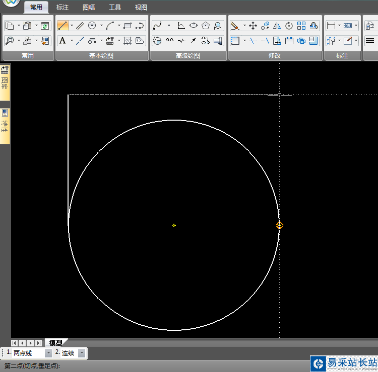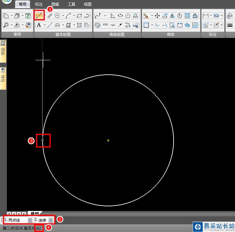 3、再以圓的最左邊為起點(diǎn),向上繪制長(zhǎng)62的豎直直線,接著如圖對(duì)齊繪制長(zhǎng)100的水平線段,再向下繪制豎直直線與圓相切;