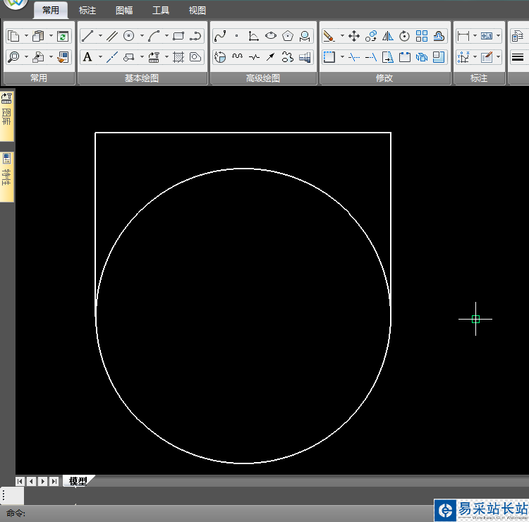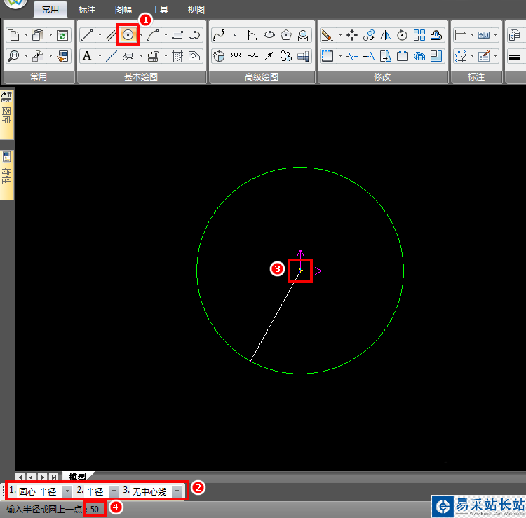 2、先繪制主要外形,使用圓命令,以坐標(biāo)原點(diǎn)為圓心繪制直徑為100的圓;