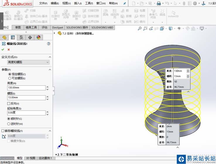 3、選定上視基準面,正視所選基準面,利用圓弧命令進行繪草圖,并設定相關尺寸。采用螺旋線特征命令,點擊確定。