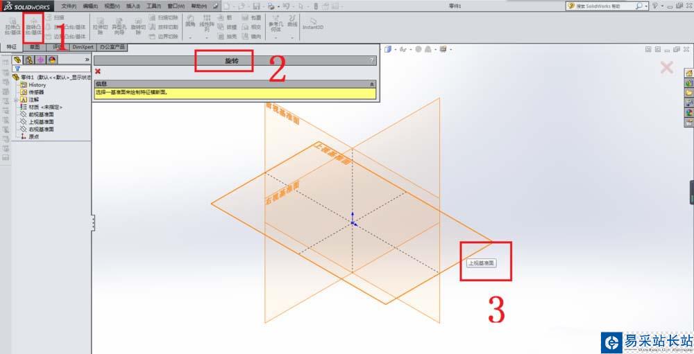 2、在“特征”工具欄中找到“旋轉凸臺/基體”圖標(1號紅色框選),點擊它,就出現如下圖所示的“旋轉對話框,”(2號紅色框選),然后我們點擊上視基準面(3號紅色框選),以它為草圖平面繪制草圖。