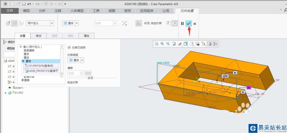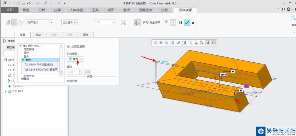 9、新建一個約束,約束類型設為“重合”,單擊”ASM_FRONT“基準面和”PNT0“基準點。