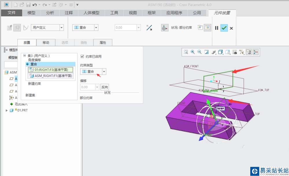 7、由于只有一個角度偏移約束零件不能被完成約束,下面添加其它約束。新建一個約束,約束類型設為“重合”,單擊”ASM_RIGHT“和”RIGHT“兩個基準面。