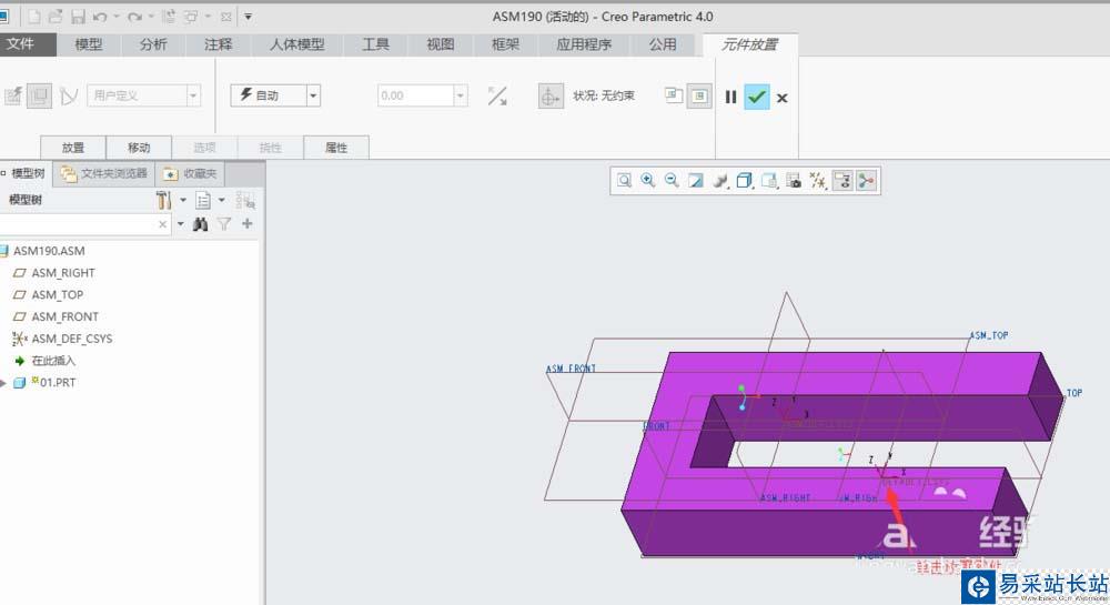 10、通過以上4組約束后,零件”01.PRT“完成被約束,單擊“元件放置”操作板中的“確定”按鈕,完成零件裝配。